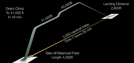 Performance 性能 Falcon performance 獵鷹性能 機會就在眼前。2000S有直飛3,350海里無需加油的續(xù)航能力, 有無與倫比的飛行速度和靈活性,以及舒適寬大的客艙,其誘人的魅力無法阻擋。 Go direct 直飛 With its certified altitude of 47,000 ft and its power to climb directly to 41,000 ft, the Falcon 2000S takes you above most traffic and weather. And it can fly 3,350 nm nonstop. Due to its excellent short field capabilities, you can take off and land at smaller, more convenient airports. 獵鷹2000S具有47,000英尺的最大認證高度,直接爬升41,000英尺,不費吹灰之力。獵鷹2000S能帶領乘客穿云破霧,突破各種航行和氣候條件限制,即使連續(xù)飛行3,350海里也無需?。加上完美的小場地操控性能,可更好地起飛降落各類機場,為您提供更多便捷服務。 ![]() 達索獵鷹2000S公務機直飛 Expanding your horizons 擴大您的視野 從北京到新加坡,從香港到孟買,從成都到雅加達無須中途?。即使穿越亞洲直到歐洲的飛行任務,也僅需?恳淮尉湍軋A滿完成。獵鷹2000S本身就是一個經(jīng)典杰作。 BFL at MTOW: SL - ISA 4,325 ft 1,318 m