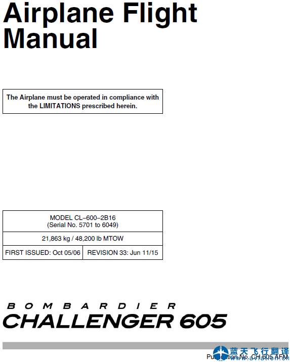 北京藍天飛行翻譯公司完成公務(wù)機公司的第33版龐巴迪挑戰(zhàn)者605全套飛行手冊翻譯任務(wù) REVISION 33: Jun 11/15 Bombardier Challenger 605 Flight Manual Translation 第33版龐巴迪挑戰(zhàn)者605飛機飛行手冊 Bombardier Challenger 605 Airplane Flight Manual 主要更新有 Abnormal Procedures: Introduces the following changes to the Airplane Flight Manual: Addition of instructions during AFCS failures. ![]() 第33版龐巴迪挑戰(zhàn)者605機組操作手冊 Bombardier Challenger 605 Flight Crew Operating Manual 主要更新有: Revision to Volume 1 introducing changes to reflect Airplane Flight Manual revision 33: Abnormal Procedures. ![]() 第33版龐巴迪挑戰(zhàn)者605快速檢查單 Bombardier Challenger 605 Quick Reference Handbook 主要更新有: Introduces changes to the QRH to reflect AFM revision 33, Jun 11/15. |