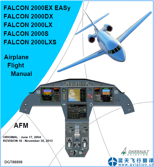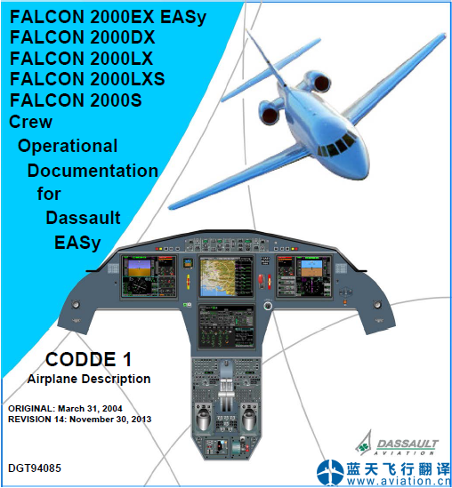 北京藍(lán)天飛行翻譯公司完成金鹿公務(wù)機(jī)公司的達(dá)索獵鷹2000公務(wù)機(jī)全套飛行手冊翻譯任務(wù) Dassault FALCON 2000 Business Jet Manual Translation 達(dá)索獵鷹2000公務(wù)機(jī)全套飛行手冊包括: FALCON 2000EX EASy、FALCON 2000DX、FALCON 2000LX、FALCON 2000LXS、FALCON 2000S 機(jī)型 Crew Operational Documentation for Dassault EASy CODDE 1 Airplane Description REVISION 14: November 30, 2013 獵鷹2000EX EASy、獵鷹2000DX、獵鷹2000LX、獵鷹2000LXS、獵鷹2000S 機(jī)型 達(dá)索EASy機(jī)組操作手冊 CODDE 1 飛機(jī)描述 修訂14: November 30, 2013 ![]() 獵鷹2000公務(wù)機(jī)機(jī)組操作手冊 FALCON 2000 Crew Operational Documentation for Dassault EASy FALCON 2000EX EASy、FALCON 2000DX、FALCON 2000LX、FALCON 2000S、FALCON 2000LXS 機(jī)型 Crew Operational Documentation for Dassault EASy CODDE 2 REVISION 16 : November 30, 2013 ![]() 獵鷹2000公務(wù)機(jī)機(jī)組操作手冊 FALCON 2000 Crew Operational Documentation for Dassault EASy F2000EX EASy、F2000DX、F2000LX、F2000S、F2000LXS Operations Manual CODDE3 Quick Reference Handbook 1和2 Revision 18 30-NOV-13 F2000EX EASy、F2000DX、F2000LX、F2000S、F2000LXS 操作手冊l CODDE3 快速檢查單 1和2 修訂 18 30-NOV-13