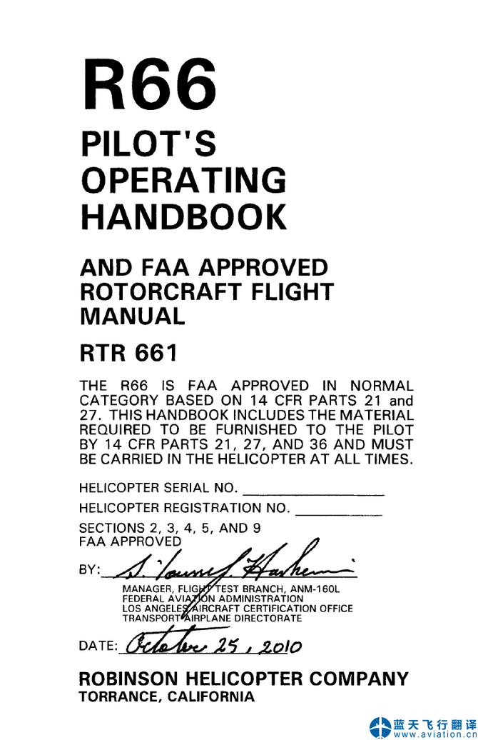 藍(lán)天飛行翻譯公司完成大型通用航空公司的羅賓遜R66飛行員操作手冊(cè)翻譯任務(wù) ROBINSON R66 Pilot's Operating Handbook Translation