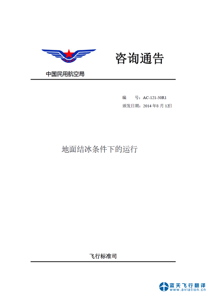 北京藍(lán)天飛行翻譯公司承接中國民用航空局飛行標(biāo)準(zhǔn)司地面結(jié)冰條件下的運行咨詢通告翻譯 CAAC Advisory Circular Translation: Ground Operation In Icing Conditions ![]() 地面結(jié)冰條件下的運行咨詢通告 地面結(jié)冰條件下的運行咨詢通告的內(nèi)容包含有: 中國民用航空局咨詢通告