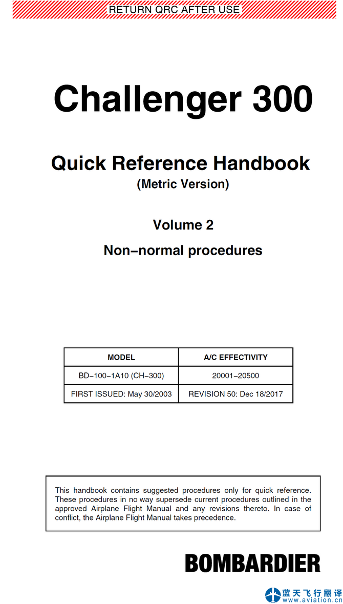 北京藍(lán)天飛行翻譯公司完成大型公務(wù)機(jī)公司2017年12月18日版本龐巴迪挑戰(zhàn)者300公務(wù)機(jī)快速檢查單翻譯任務(wù) Rev 50, Dec 18/2017 Bombardier Challenger 300 Quick Reference Handbook Translation