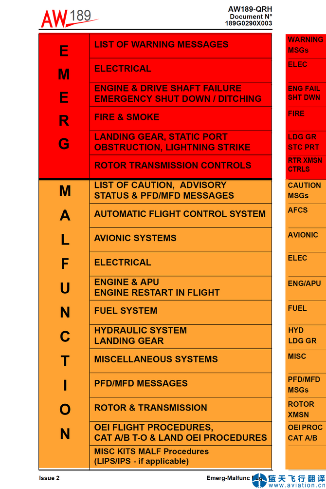 AW189直升機快速檢查單(Quick Reference Handbook(QRH))的主要內(nèi)容包含有: