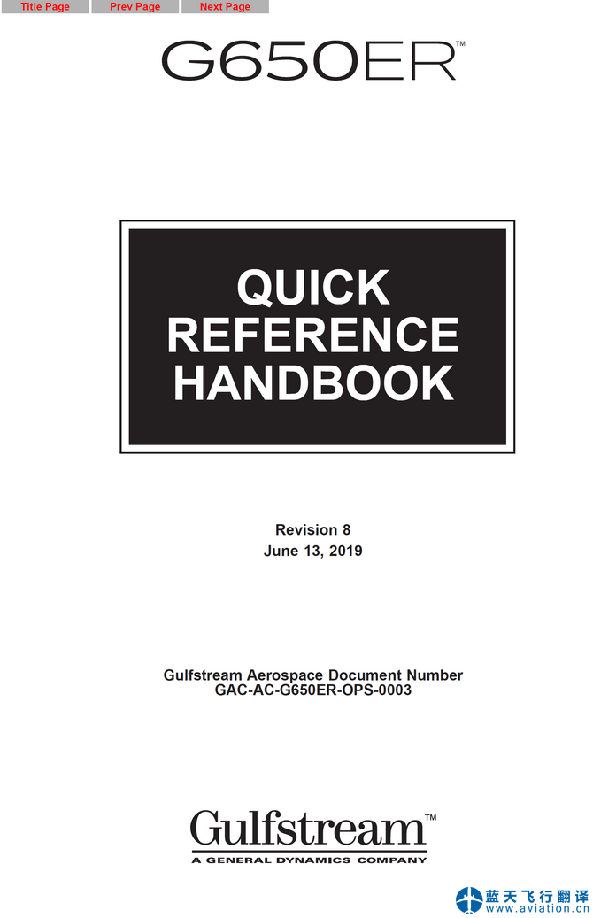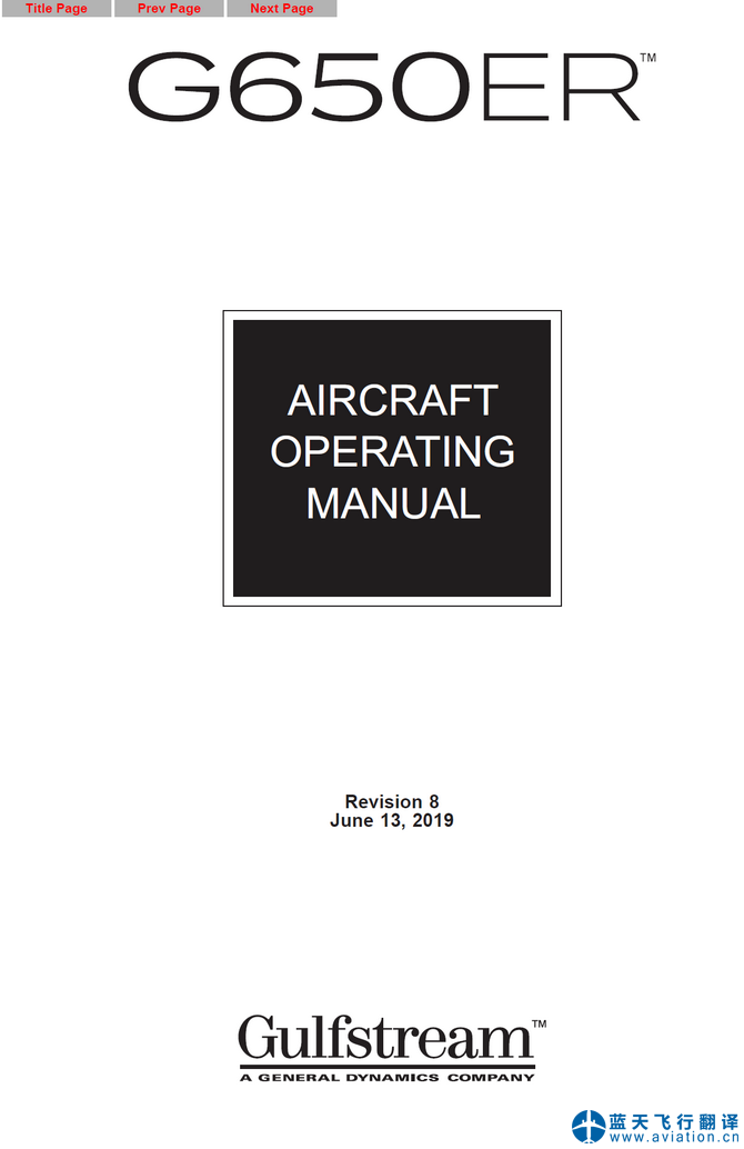 北京藍(lán)天飛行翻譯有限公司完成2019年6月13日版本灣流G650ER飛機(jī)操作手冊、快速檢查單和飛機(jī)飛行手冊翻譯任務(wù) Revision 8 June 13, 2019 G650ER AIRCRAFT OPERATING MANUAL, G650ER QUICK REFERENCE HANDBOOK and G650ER AIRPLANE FLIGHT MANUAL Translation