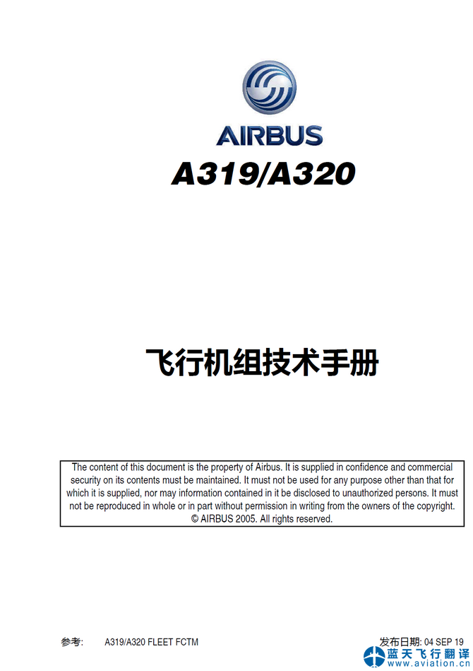 本次翻譯的A320飛行手冊包含45架飛機、320-214和319-115兩個機型,手冊包含有A320飛行機組操作手冊(FCOM FLIGHT CREW OPERATING MANUAL)、A320飛機飛行手冊(AFM AIRPLANE FLIGHT MANUAL)和A320飛行機組技術手冊(FCTM FLIGHT CREW TECHNIQUES MANUAL),版本為2019年9月4日。