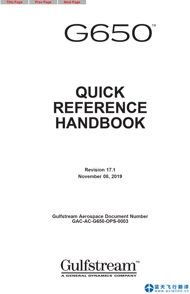 北京藍(lán)天飛行翻譯公司本次翻譯的灣流G650快速檢查單(QUICK REFERENCE HANDBOOK)版本為17.1版,修訂日期為2019年11月8日。