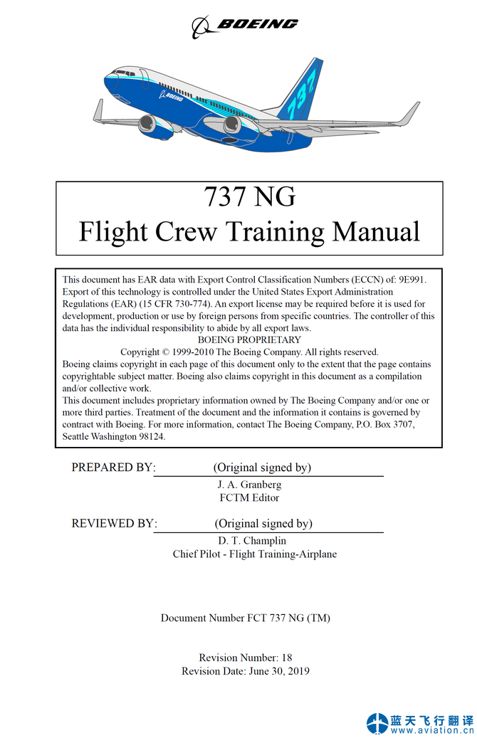 北京藍(lán)天飛行翻譯公司本次翻譯的波音737NG飛行機(jī)組訓(xùn)練手冊(Flight Crew Training Manual)版本日期為2019年6月19日,適用737-600、737-700、737-800、737-900、737-900ER機(jī)型。