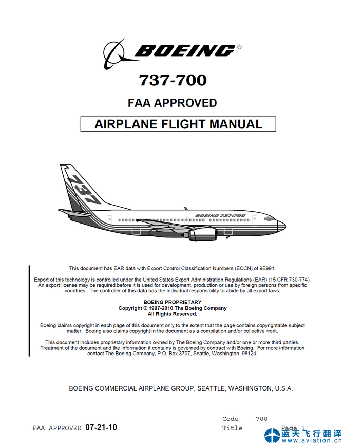 北京藍(lán)天飛行翻譯公司承接航空公司波音737-700飛機(jī)飛行手冊翻譯任務(wù) 08-05-19 737-700 Airplane Flight Manual Translation
