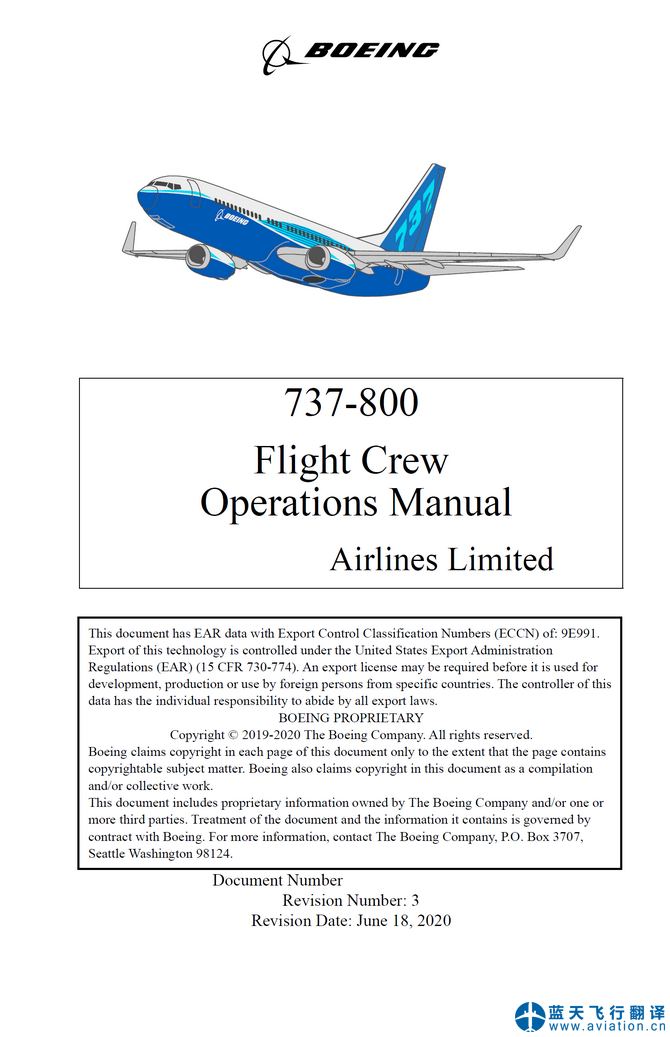 北京藍(lán)天飛行翻譯公司本次翻譯的波音737-800飛行機(jī)組使用手冊(cè)(Flight Crew Operations Manual)和快速檢查單(Quick Reference Handbook)版本日期為2020年6月18日,包含5架波音737-800飛機(jī)。